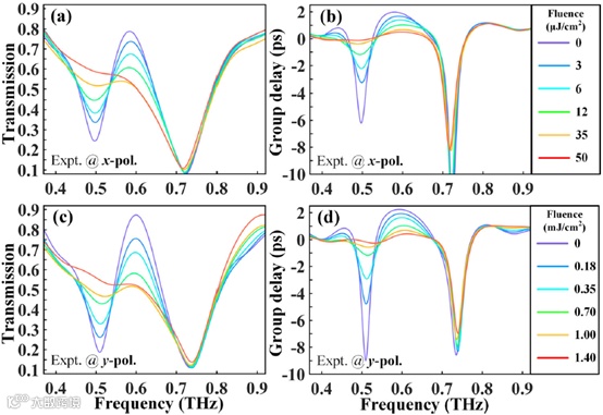(a,b)在0μJ/cm2到50μJ/cm2的不同光泵浦影响下,选择低光泵浦功率级记录x偏振太赫兹入射的太赫兹传输和群延迟光谱色散。(c,d)在0~1400μJ/cm2泵浦影响下测量y偏振太赫兹入射的太赫兹传输和群延迟谱。