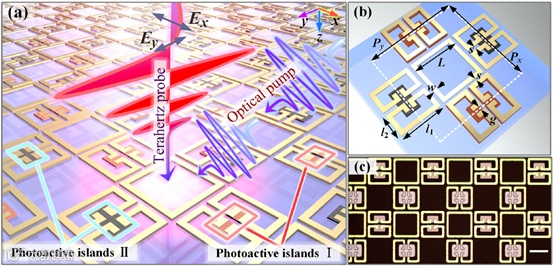 (a)对超光子器件配置的艺术描述,其中太赫兹极化依赖的时间调制依赖于光载流子,在光活性层I(晶硅)和II(非晶态锗)产生三个量级的弛豫时间差。太赫兹波沿-x和-y方向的偏振可以被调制,具有不同的瞬态动力学。(b)单元内的亚原子设计,几何参数为:L=55μm,l1=49μm,l2=26μm,s=4μm,g=4μm,w=5μm,Px=112μm,Py=112μm。其中,金元原子、晶硅、非晶锗和蓝宝石衬底的厚度分别为200nm、500nm、200nm和500μm。(c)在蓝宝石衬底顶部制作的元器件的光学图像。