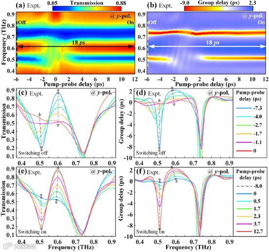 (a,b)通过扫描光泵太赫兹探测延迟测量的传输和群延迟切换动力学的假彩色图。箭头显示整个开关周期时间为<25 ps,表明比x偏振情况快两个数量级。(c-f)分别从(a)和(b)图中提取的对应的瞬态频域传输谱和群延迟谱。此处泵注量选择为1400 μJ/cm2。