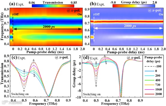 (a,b)通过扫描光泵太赫兹探测延迟测量的传输和群延迟切换动力学的假彩色图。箭头表示演化过程的完全恢复时间>2ns,表示一个相对缓慢的开关过程,可以视为准稳态。(c,d)分别从恢复期间不同时延对应图中提取的瞬态频域传输谱和群时延谱。泵注量为50μJ/cm2。