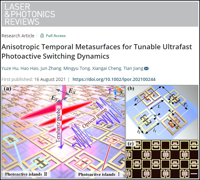 Hu,Y., Hao, H., Zhang, J., Tong, M., Cheng, X., Jiang,T., Anisotropic Temporal Metasurfaces for Tunable Ultrafast Photoactive Switching Dynamics. Laser & Photonics Reviews 2021, 2100244.