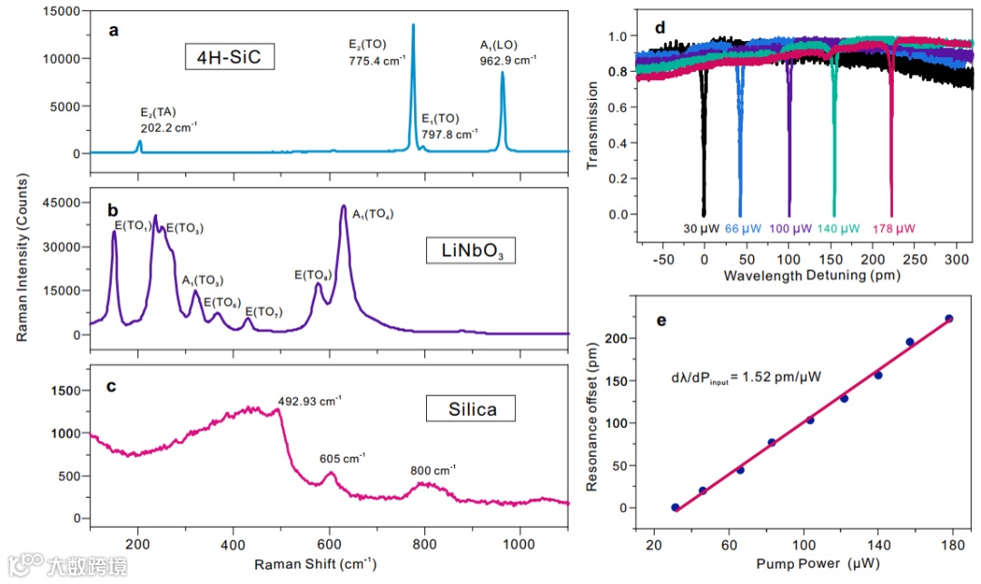 图3 (a)-(c) 4H-SiC、LN和氧化硅的拉曼强度对比。(d)、(e) SiC微腔的功率-频移关系。