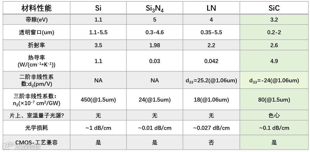 集成光子学领域一直在寻找新材料平台,该平台需要与硅基CMOS工艺兼容,同时应具备低损耗、高折射、高非线性系数、高功率耐受性等特性。当前多种材料被发展,如铌酸锂(LiNbO3) 、磷化铟(InP) 、氮化硅(Si3N4) 、碳化硅(SiC) 等。表1对比了Si、LiNbO3、Si3N4和SiC的相关光子学性能,其中SiC几乎符合上述所有的光子学特性,因此SiC被认为是一个极具潜力的新型光子平台。