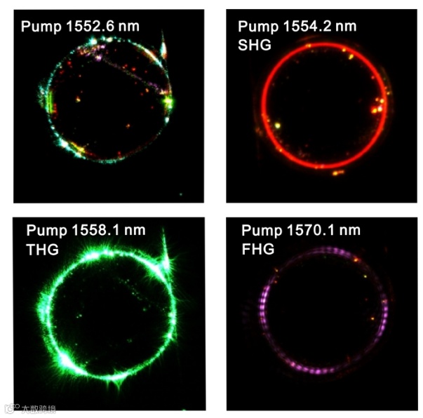 研究团队在高Q微腔观测到了丰富的非线性效应。图4展示了泵浦光在C波段附近扫频时,CCD所记录的谐波产生现象,微腔中发射出色彩斑斓的亮光。亮光在光谱表现为特定波长的发光峰,来源于碳化硅的二阶、三阶非线性过程。根据谐波生成的能量守恒原则,对比光谱可知,图4中红光、绿光和紫光的产生来源于二次谐波、三次谐波和四次谐波现象。