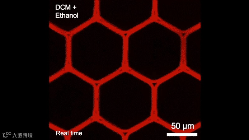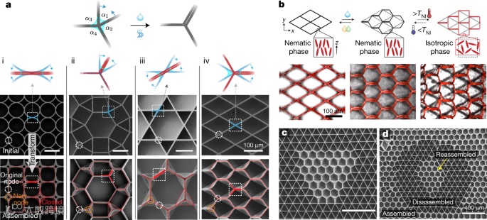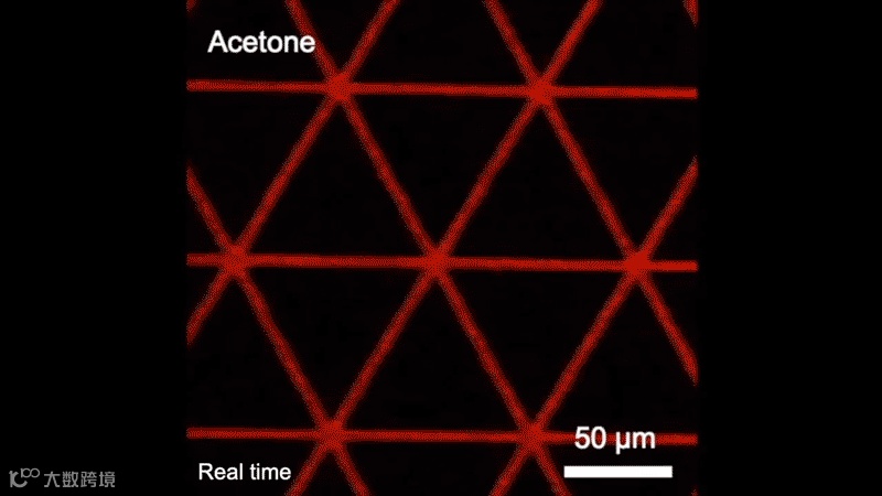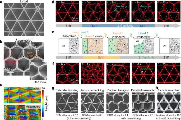 很快,李姝聪想到了利用双组分溶液,即乙醇和二氯甲烷的混合物。当两种液体混合物加入微结构中,一种液体会突然溶胀,就相当于把材料给‘撕开’;此时另外一种液体相当于是作为一种稳定剂,防止前面液体蒸发的时候又把它给组装上。正是这个小小的技巧,让六边形网格能够再次变换回三角形(图2e-f)。