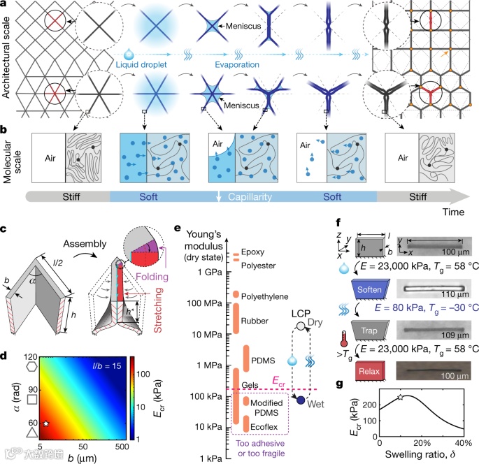为了验证该策略的可行性,李姝聪和邓博磊采用微结构翻模的方法,基于聚丙烯酸酯液晶弹性体,组装了一块三角形网格的蜂窝微结构(边长100微米,深70微米,图2a)。当滴加一滴丙酮溶液之后,高分子液晶弹性体材料开始溶胀软化,边长边长,结构失稳。随着溶剂的蒸发,软化的壁面被节点处产生的毛细力两两组装到一起,原本的三角形网格也被重组成了六边形网格(图2b-f)。这一变形过程只需要10秒。