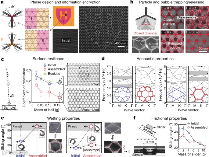 在这项研究中,李姝聪等人利用一滴溶液将三角形网格的微结构组装成六边形网格,实现了结构的拓扑变化。然而,组装后的结构无论是经过高温,或者泡在液体里很长时间,都能保持六边形构型,表现出了很强的稳定性。