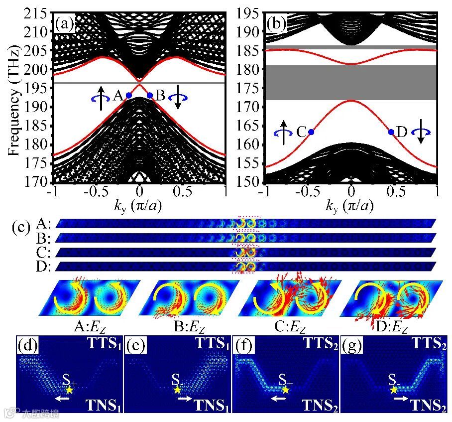 图4 投影能带图:(a) 左、右侧结构分别为可产生TTS1、TNS1的超晶胞(左右两侧均含18个原胞);(b) 左、右侧结构分别为可产生TTS2、TNS2的超晶胞(左右两侧均含18个原胞);红色曲线、灰色区域分别表示边界态能带、带隙,箭头表示各点电场自旋方向。(c) 图4(a)-4(b)中A、B、C、D四点表示长条状超晶胞的电场分布及其坡印廷矢量的局部放大图。两组U字型波导设置