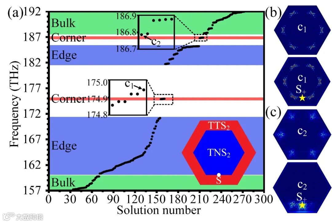 图5 产生TTS2、TNS2 的PC界面处出现多维边界态:(a) 六边形箱形结构(右下角插图所示:由产生TTS2的 PC包围产生TNS2的 PC)的解数量;红色、蓝色及绿色分别表示角态、边界态及体态所对应的频率范围区域。图5(a)中选定两频率点c1、c2,箱形结构中参数化扫描的模式图(上侧)及设置点源