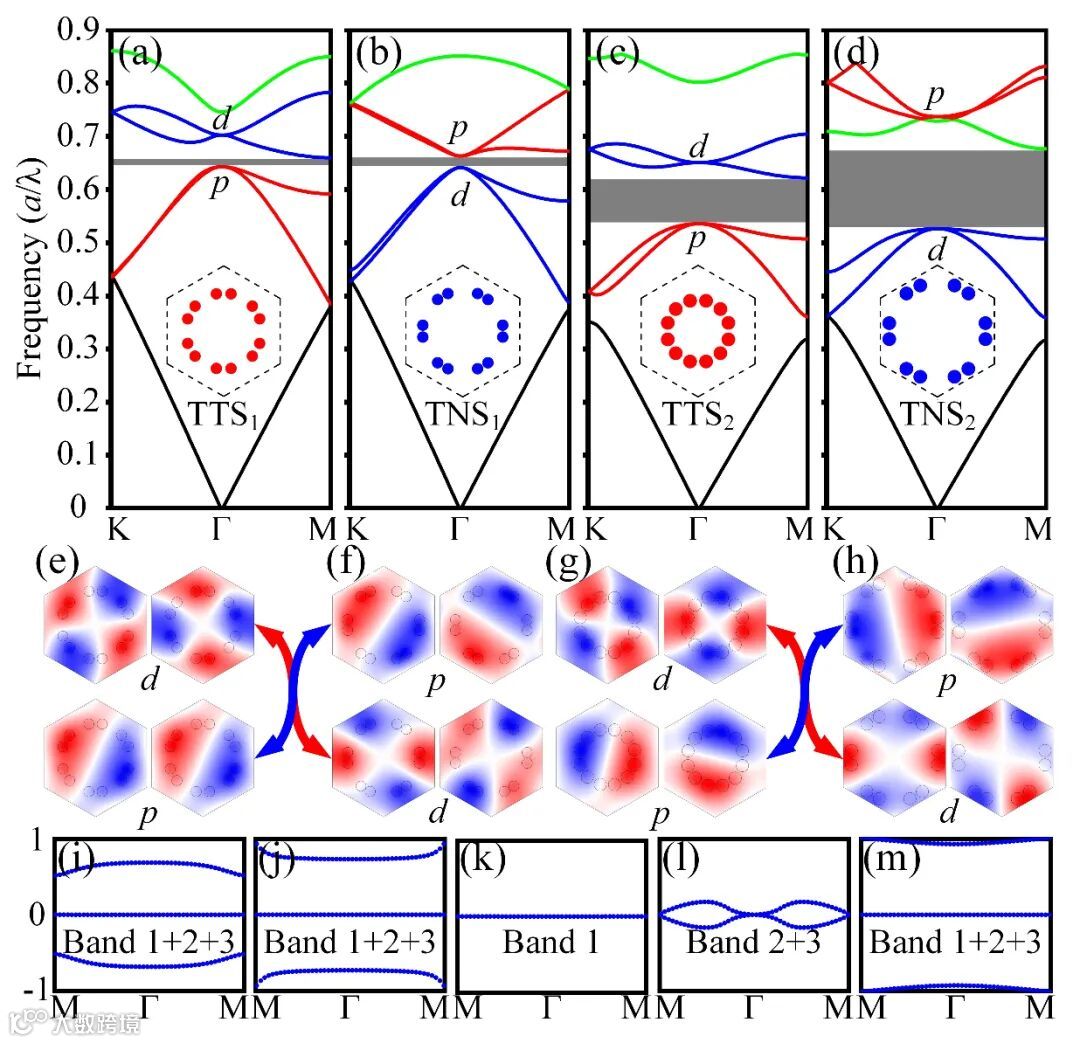 图3 不同结构组合参数(l,h,r)PC的能带结构:(a) (6.5,33,5);(b) (13,33,5);(c) (7,80/3,6);(d) (15,40,6)。红色、蓝色曲线分别标注了p-type、d-type能带,灰色矩形表示带隙,插图原胞用红蓝色标注出电介质柱位置与图2(c)的对应关系。Γ点电场Ez分布:(e)TTS1;(f) TNS1;(g) TTS2;(h) TNS2。万尼尔中心位置:(i) TTS1;(j) TNS1;(k)与(l) TTS2;(m) TNS2。