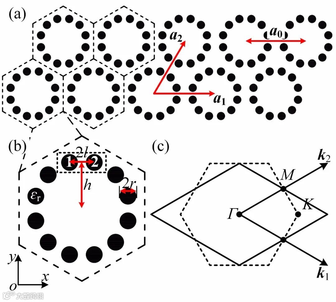 图1 (a) 光子晶体模型图,晶格常数a0=1μm,三角晶格基矢a1、a2;(b) 图(a)中原胞的放大图,电介质柱1(rod1)与2(rod2)圆心的距离为2l(定义为:两电介质柱在原胞中的切向距离),两电介质柱圆心连线的中点到原胞中心的距离为h(定义为:双电介质柱离原胞中心的径向距离),两电介质柱半径均为r,且介电常数εr=11.7,背景为空气;(c) 12个电介质柱构成六边形原胞的第一布里渊区(BZ)被重构成菱形,倒格矢的基矢k1、k2。