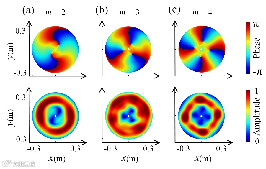 图4:高阶远场涡旋声束的横截面图。a-c 分别展示了拓扑阶数从2到4的不同情况。其中上面部分是压力场的相位分布,下面部分显示的是压力场的振幅分布。