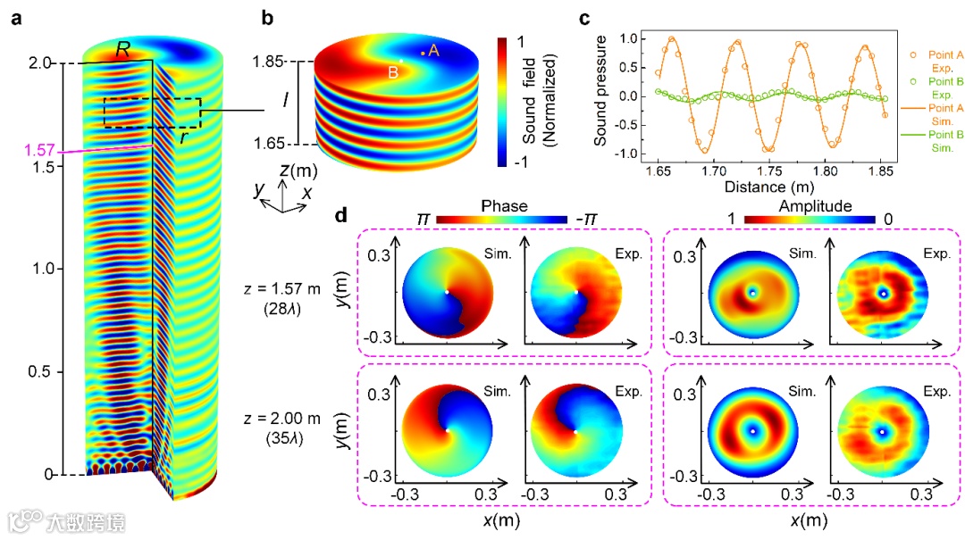 图3:自由空间中的远场涡旋声场。a 在剖视图中沿传播轴的归一化声压场。所取圆柱体与超表面大小相同,近场和远场之间的临界点约为1.57 m;b 远场旋转波前局部放大图;c 为沿b中A点和B点的轴线方向模拟和测量得到的声压分布;d 为分别在距超表面1.57 m和2.00 m处的两个观测平面上模拟和测量得到的螺旋波前的相位和幅值分布。白点是指相位横截面的几何中心。
