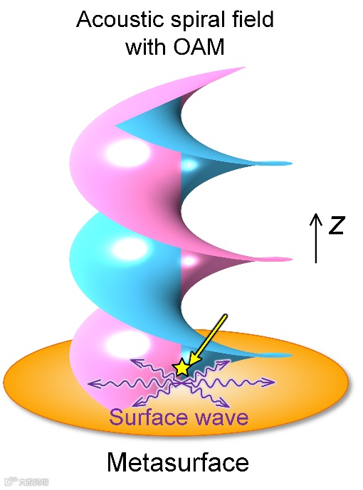 图1:超表面螺旋天线示意图。轴对称Spoof声表面波(紫色波包)由位于超表面天线(橙色平板)中心的单极子点声源(黄色五角星)激发,并被转换为带一阶OAM的螺旋波束辐射到远场。