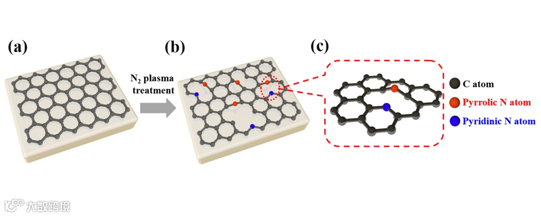 针对上述问题,该研究团队开展了石墨烯/SiC衬底上GaN薄膜的外延生长研究,并分析了石墨烯上生长GaN薄膜的外延机理。在此工作中,采用高温热解法在Si面4H-SiC衬底上制备了石墨烯。为了增强石墨烯上氮化物的成核能力,在外延生长之前采用氮等离子体对石墨烯表面进行了预处理。X射线光电子能谱测试结果表明氮等离子体预处理在石墨烯表面引入了N-sp3C悬挂键,能够为后续GaN外延生长提供更多的成核位点。基于此结果,该团队提出了石墨烯表面的成键模型,如图1所示,石墨烯在经过氮等离子体处理后,会在其表面引入N-sp2C和N-sp3C键,其中N-sp3C键中的吡咯N原子比N-sp2C键中的吡啶N原子更具反应性,因此N-sp3C键可为后续GaN外延生长提供更多的成核位点。