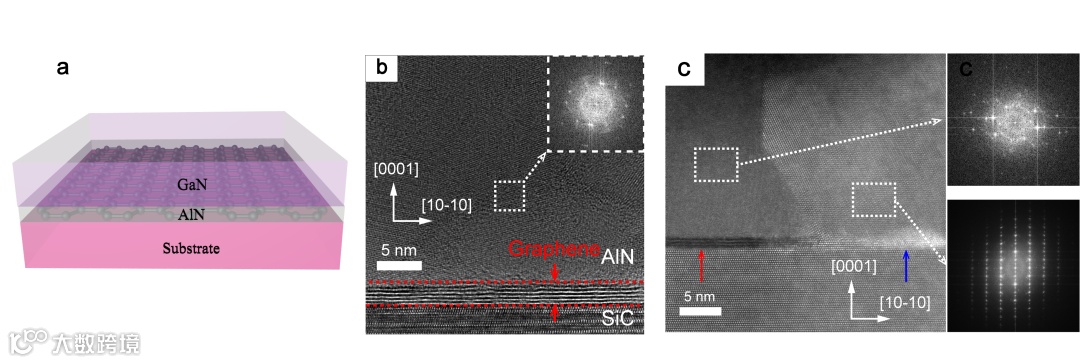 图2(a)外延结构示意图,(b)未处理石墨烯/SiC衬底上AlN/石墨烯/SiC界面区域的高倍STEM横截面图像,右上角插图为图(b)中白色矩形框区域AlN的选区电子衍射图。(c)氮等离子体预处理后石墨烯/SiC衬底上AlN/石墨烯/SiC界面区域的高倍STEM横截面图像,右侧为石墨烯不同区域上AlN的选区电子衍射图