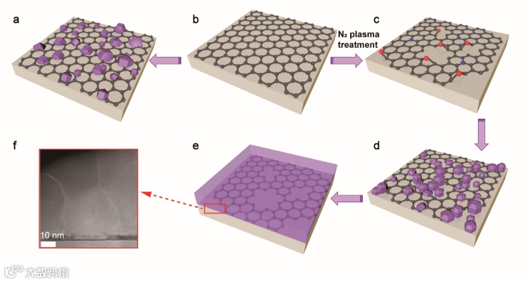 图3 石墨烯上GaN薄膜的生长模型示意图。(a)直接在未处理的石墨烯上生长AlN,AlN成核呈现出多种取向,(b)SiC衬底上制备的石墨烯的示意图,(c)石墨烯经过氮等离子体处理后在其表面形成C-N相关悬挂键,(d)在经过氮等离子体处理后的石墨烯上生长AlN,破坏区域的AlN成核取向延续了SiC衬底的取向,呈现出单晶c轴取向生长,(e)AlN缓冲层上形成连续的GaN薄膜,(f)AlN/石墨烯/SiC衬底的STEM横截面图像
