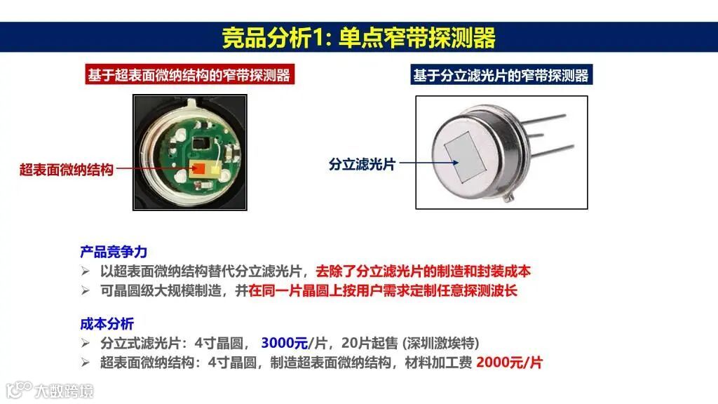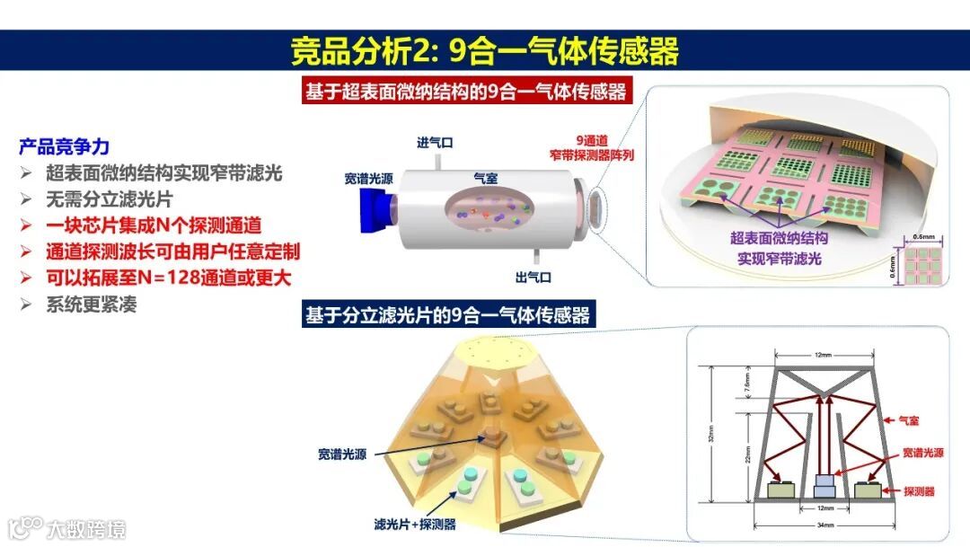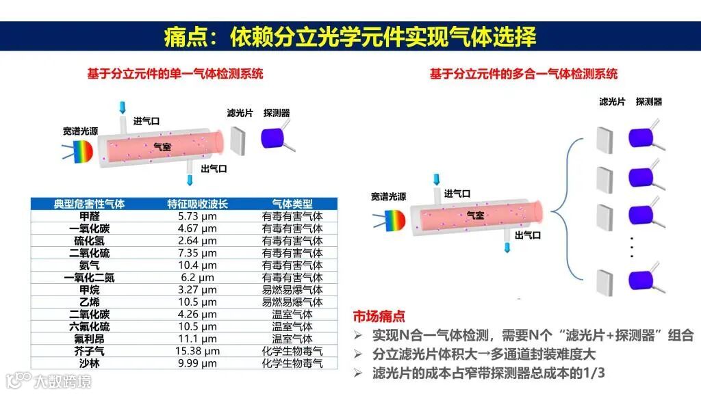 在传统的NDIR系统中,光源是宽谱的,并且没有经过滤光。当包含很宽波长范围的光束通过室内的样品气体并与之相互作用时,只有一部分光能在其特征吸收波长处被气体吸收。为了分析目标气体的浓度,通常在探测器前面添加一个分立式窄带滤光片,以去除光束中不想要的波长,并且仅允许气体的特征吸收波长到达探测器。换句话说,传统NDIR系统中的光谱选择性是通过添加滤光片而不是通过探测器直接实现的。