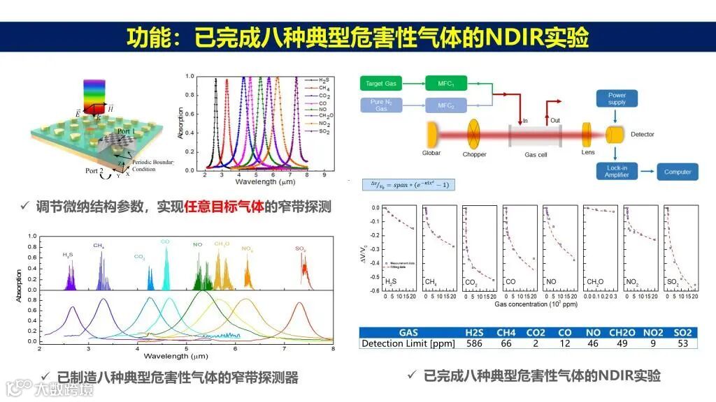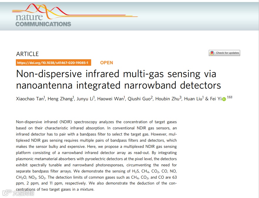 总之,在这个工作中,课题组完成了窄带热释电探测器的设计、制造、性能测试,并展示在NDIR气体传感中的应用。这种窄带探测器是通过将基于金属光学天线的超构材料窄带吸收体直接集成到钽酸锂单晶晶片上实现的。通过调整超构材料吸收体的设计,可以实现窄带探测器的探测波长在整个中红外波段内连续可调。实际制造了8个窄带探测器,其探测波长与8种典型气体(H2S, CH4, CO2, CO, NO, CH2O, NO2, SO2)的特征吸收波长匹配,并用自制的NDIR系统中实现了对各气体浓度的测量。工作还设计了一种简单的混合气体测量实验,也即用两个窄带探测器测量两种目标气体(CO和SO2)的混合物,构建相应的数学模型。该模型可以根据两个探测器的测量响应反向推算气体混合物中两种气体的浓度占比。