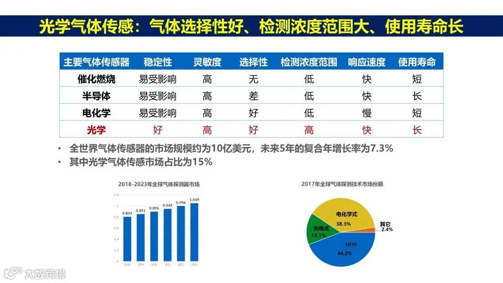 自然界中的每种气体都会因为自身分子的振动而吸收电磁波,而气体分子的振动频率则对应该气体的特征吸收波长。例如,常见的温室气体二氧化碳,对波长为4.26μm的电磁波有较强的吸收,而另一种温室气体六氟化硫,则在10.5μm处有较强的吸收。又比如硫化氢是一种有毒气体,它在2.64μm处有较强的吸收,而另一种有毒气体沙林的特征吸收波长为9.99μm。可以看出,很多气体的特征吸收波长,都位于中波红外(3μm~5μm)和长波红外波段(8μm~14μm)这两个大气窗口中,因此整个中红外波段被公认是大多数危险化合物和气体的“指纹区”。这样,中红外光谱气体探测器可以用于高灵敏度和高选择性地识别和量化气体的存在。非色散红外(NDIR)光谱仪是中红外光谱气体探测器之一,可根据分子振动引起的中红外特征吸收波长来分析气体,其可在追踪气体探测、呼吸分析、环境监测等领域广泛应用。