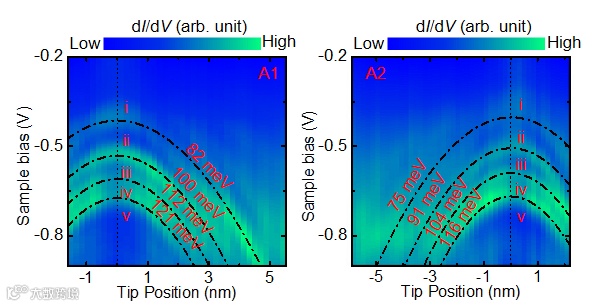 分别跨越两个相同类型缺陷(上图(a)中的A1和A2)的线路径微分电导谱。其中,垂直虚线标记了A1、A2缺陷的位置,点横线代表了计算得到的对应每一个充电峰的针尖引起的能带弯曲,弯曲能量如图标注所示。