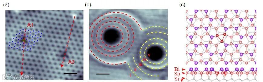 研究者发现,如果使用电负性非常相近的两种金属元素构建出具有饱和价电子的二维材料,那么由于两种元素的价电子被饱和,材料具有较大的带隙,同时电负性的极性相近,材料中的缺陷态很容易形成非局域化状态。他们以生长在Si(111) 表面的二维类金属半导体Sn2Bi为平台,深入研究了其中单个Bi空位缺陷的电子态特征,并利用扫描隧道显微镜(STM)的针尖施加顶栅电场,成功在Bi空位缺陷上实现了多达五重电荷态的操控。