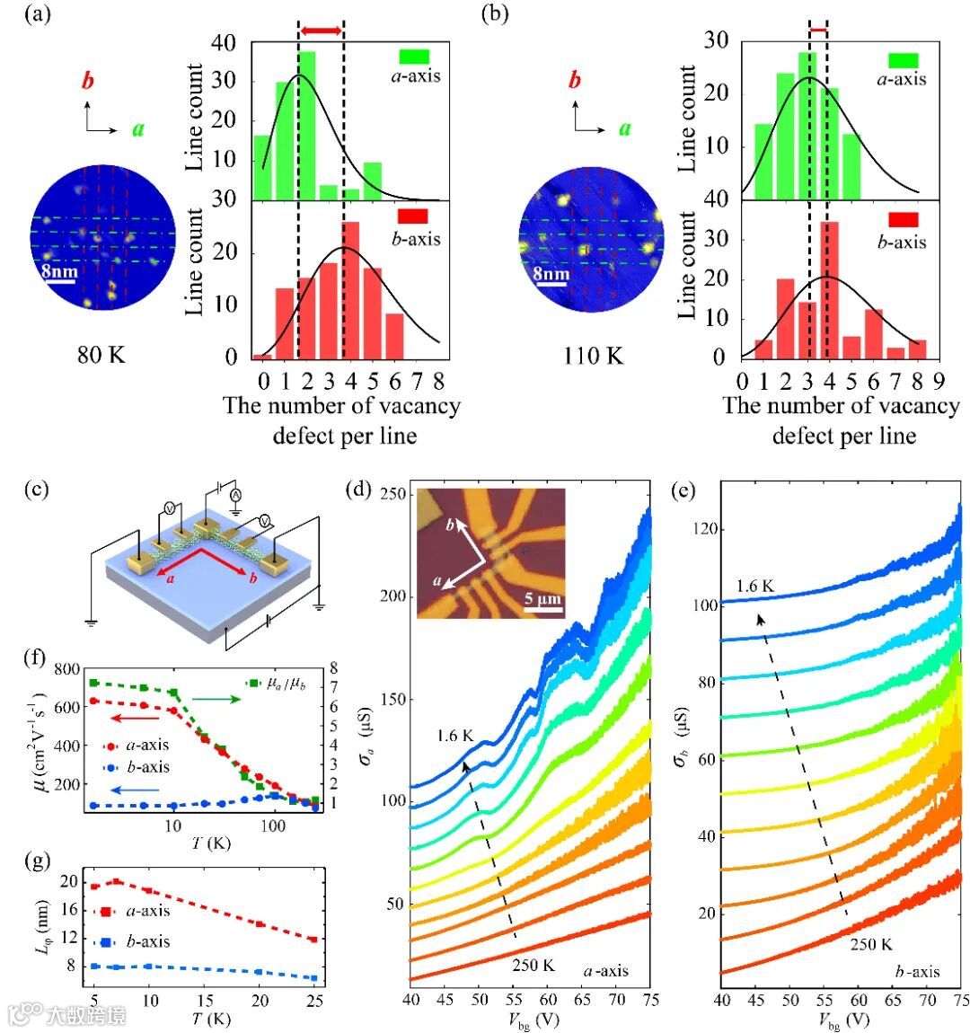 图1.(a)80K和(b)110K对应的PdSe2 STM形貌图以及Vse沿着a轴和b轴分布的统计直方图。(c)PdSe2器件和电学输运测量电路示意图。(d)和(e)a轴和b轴在不同温度下随栅压变化的电导率;插图:器件光学照片。(f)a轴和b轴的电子迁移率及其比值与温度的关系。(g)a轴和b轴的相位相干长度与温度的关系。