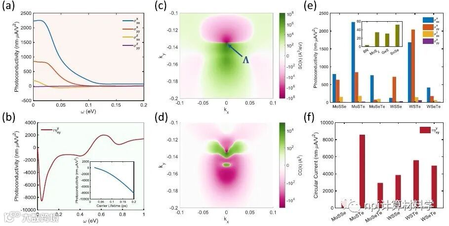 In recently published npj Computational Materials , Prof. Ju Li’s group,collaborating with Prof. Jing Kong’s group, extend this principle to nonlinear optical properties. They propose that materials with 1) topological band structure, 2) strong inversion asymmetry and 3) small electronic bandgap may well have excellent nonlinear optical properties. Besides topological band structure, strong inversion asymmetry would make two opposite directions in space (e.g., left and right) very different, so that electrons would have strong inclination to move in one direction, rather than the opposite, and the net charge current would be larger. In addition, small bandgaps can also make the electron interband transitions faster. This is somewhat similar to ascending steps. It is always easier to ascend lower steps. Guided by above theoretical principles and previous experimental results from Prof Jing Kong’s group, they predict a new class of topological materials: 1T’ phase Janus transition metal dichalcogenides (JTMDs), which have colossal nonlinear photoconductivity. With first-principle calculations, they find that the shift current conductivity in 1T’JTMDs can be as large as 2300 nm·μA·V−2, and the circular current conductivity can be on the order of 104 nm·μA·V−2 as well, which are larger than that of commonly used nonlinear materials by 1 to 2 orders of magnitude. In other words, the photocurrent in 1T’ JTMDs can be 10~100 times stronger than that in other materials under the same light illumination. Because1T’ JTMDs have small bandgaps (on the order of 10 meV ~ 2.5 THz), they can be used for photodetection in the THz range. The authors also find that under external stimuli such as in-plane strain and out-of-plane electric field, 1T’JTMDs can undergo topological phase transitions. And upon the phase transitions, the shift current can abruptly flip its direction, which can be used to characterize topological phase transitions. Their findings broaden our understandings on the optoelectronic properties of topological materials, and provide theoretical guidance for finding more materials with outstanding optical properties.