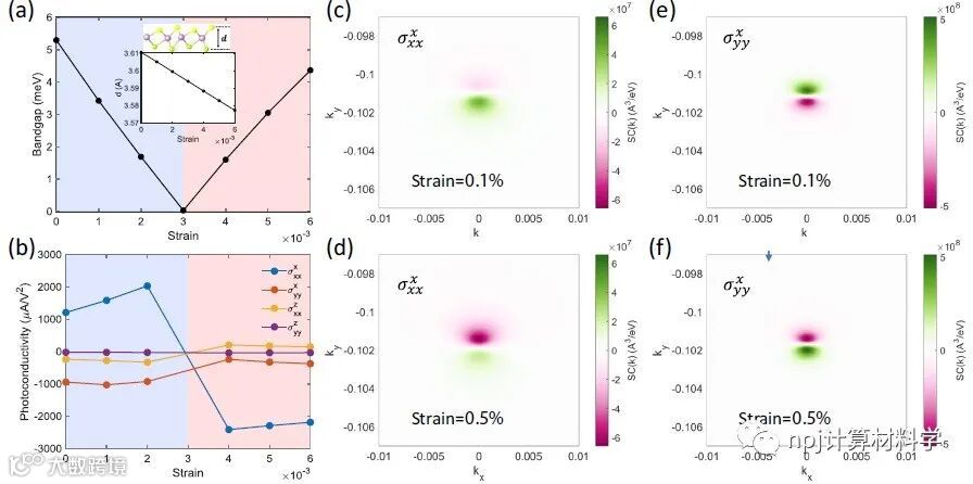 近日,李巨教授课题组在npj Computational Materials 中报道了他们在此领域的最新工作。他们联合MIT孔敬(Jing Kong)教授课题组将这一思想进一步拓展至非线性光学材料中,提出同时拥有1)拓扑型电子能带杂化,2)强烈的空间不对称性和3)较小能隙的材料,很可能具有优异的非线性光学性质。除了拓扑能带杂化之外,强烈的空间不对称性会使得空间中的两个相反的方向(比如向左和向右)变得极为不同,这样电子朝着某一特定方向移动的“意愿”更强,而向相反方向移动的“意愿”更弱。如此,就能产生更大的净电流。而能隙小的情况下,电子在价带和导带之间的跃迁也会变快。这有点儿像上台阶时,如果台阶比较矮,那么上起来就会比较容易。基于上述原理和孔敬教授课题组前期在二维非对称材料(Janus 过渡金属硫化物)中的实验成果,他们预测了一类新型的拓扑1T’相的Janus(双面神)过渡金属硫化物(Janus transition metal dichalcogenides, JTMDs),并且发现其拥有巨大的非线性光电导性。作者通过第一性原理计算发现,1T’ JTMDs的位移电流电导率可以达到2300 nm·μA·V−2(相当于2800 mA/W),而Circular current电导率则能达到104 nm·μA·V−2量级。这比过去常用的非线性材料的光学响应增强了1至2个数量级。也就是说与之前常见的材料相比,人们可以用更低强度的光照射JTMD材料,即可在材料中获得更大的光电流。由于1T’ JTMDs的能隙很小(10 meV量级,相当于2.5 THz),它们可被用于THz波段的光探测。该团队进一步发现,利用弹性形变和外加电场这样的外部刺激可让1T’ JTMDs发生电子态的拓扑相变,在相变前后位移电流的方向会发生反转。这样一个光电流方向的骤变可以用来表征拓扑相变,在光力学、光电子学中也有潜在应用。作者们的研究将有助于加深对拓扑材料光电性质的理解,并为未来寻找更多具有优秀光电性质的材料提供了理论参考。该文近期发布于npj Computational Materials 7, 31 (2021).