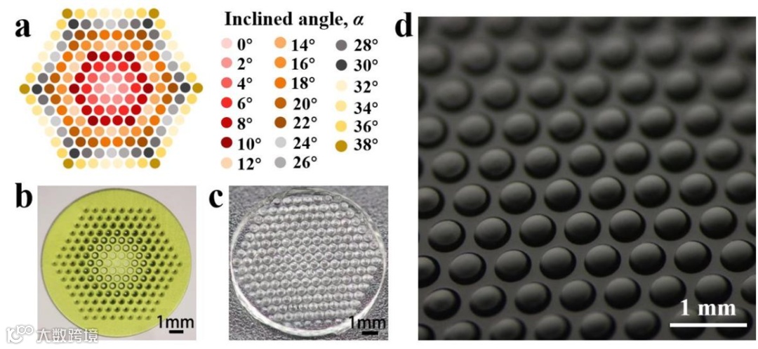 图二 (a) 多焦距微透镜阵列设计,(b) 3D打印的微孔阵列,(c) 复刻的多焦距微透镜阵列,(d) 多焦距微透镜阵列局部显微图。