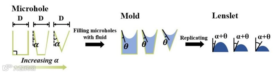 近日,上海理工大学张大伟教授课题组提出了一种多焦距微透镜阵列的制作方法。该微透镜阵列制造过程具体如下:首先,利用摩方精密面投影微立体光刻3D打印技术(nanoArch P140,BMF Precision,Shenzhen, China)制备出孔壁呈不同倾斜角度的微孔阵列,再采用旋涂的方法使微孔中残留部分光敏树脂并得到不同曲率的液面,最后经过PDMS翻模即可得到多焦距微透镜阵列。该多焦距透镜阵列能够扩展成像景深,具有感知物体深度的能力。该成果以“Fabrication of uniform-aperture multi-focus microlens array by curving microfluid in the microholes with inclined walls”为题发表在光学期刊Optics Express上。