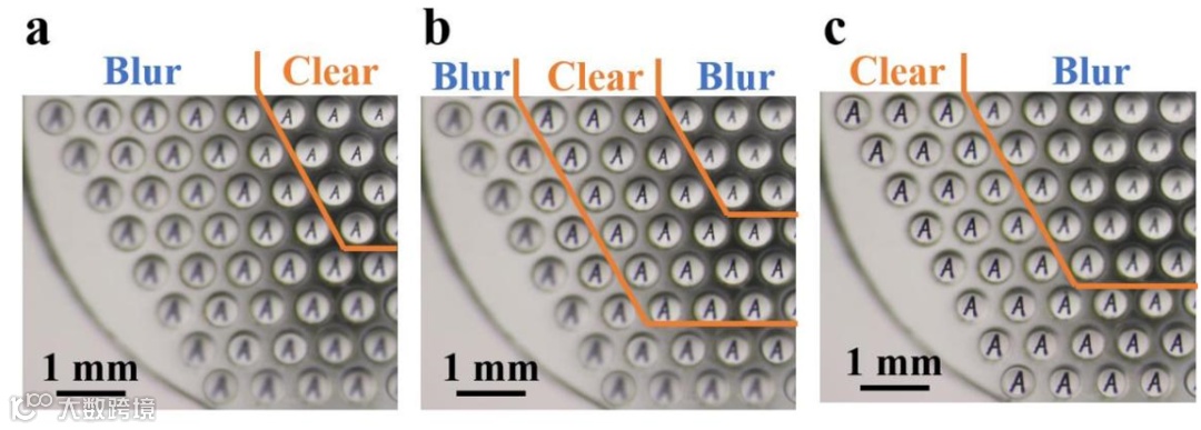 图三 利用多焦距微透镜阵列拍摄不同物距情况下的物体,物距为(a) 14.3mm,(b) 28.5mm,(c) 45.5mm时拍摄的图像。当物距为14.3mm时,中心区域的透镜可呈现清晰图像;当物体移离微透镜阵列时,外圈的透镜可以呈现清晰的图像。