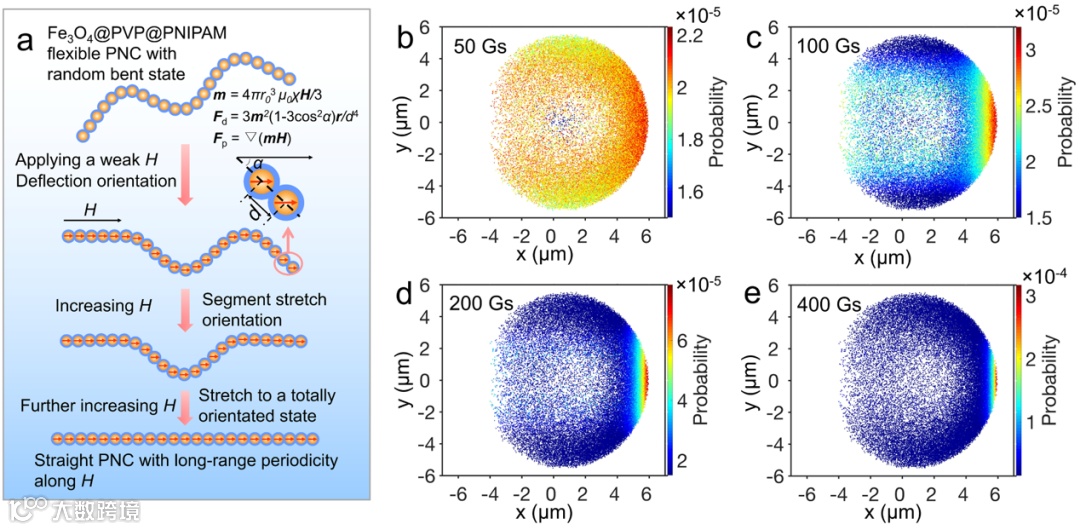 图5 柔性磁性光子晶体链在不同磁场强度下取向示意图及不同形态柔性链在不同磁场强度下沿磁场方向取向的概率分布图
