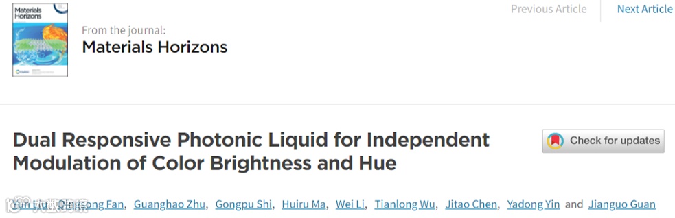 近期,武汉理工大学官建国教授课题组与加州大学河滨分校殷亚东教授课题组合作,在双响应Fe3O4@PVP@PNIPAM柔性磁性光子晶体纳米链的水分散液中实现了结构色亮度及色度的独立、连续、可逆调控,该结果可望开启新一代响应性变色材料的研制,加深对颜色调控机理的理解。所得的响应性变色液体由于颜色调控灵活、简单并且易于成型,在全色显示及自适应伪装等领域具有重要潜在应用。该工作以题为“Dual Responsive Photonic Liquid for IndependentModulation of Color Brightness and Hue”的论文发表在最新一期《Materials Horizons》上。刘云博士生为论文第一作者,马会茹副教授、殷亚东教授、官建国教授为论文共同通讯作者。