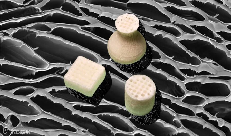 扫描电子显微镜显示的多孔内部结构的图像背景上的3D打印纤维素气凝胶。图片来源于堪萨斯州威奇托州立大学Bhisham Sharma,由Abigail Malate进行图像合成。