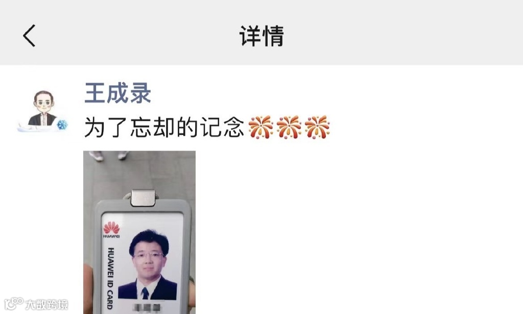 有说法称,王成录并非离职,而是基于华为的45岁退休政策,选择了退休。王成录还发布了一条朋友圈,附上自己工卡的照片并配文“为了忘却的纪念”。