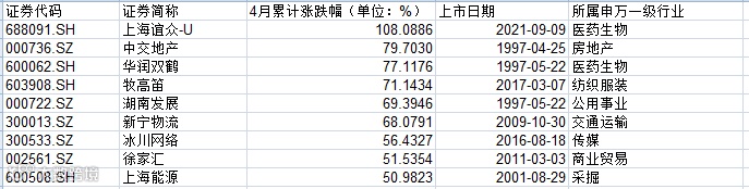 虽然4月A股表现欠佳,但仍有一些个股表现出彩,在剔除年内上市新股后,有9家上市公司本月涨幅超50%。涨幅排名依次为上海谊众-U、中交地产、华润双鹤、牧高笛、湖南发展、新宁物流、冰川网络、徐家汇、上海能源。其中上海谊众-U是本月唯一涨幅翻倍个股,累计涨幅达108.09%。