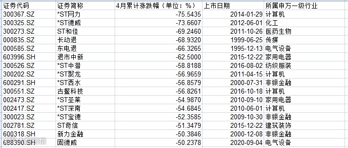 4月A股市场跌幅超50%个股