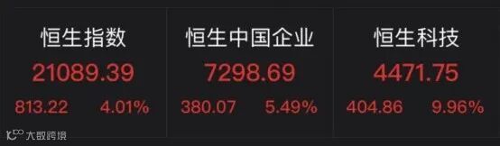 4月29日,港股大幅上涨,其中恒生科技指数涨近10%,恒生中国企业指数涨超5%,恒生指数涨超4%。