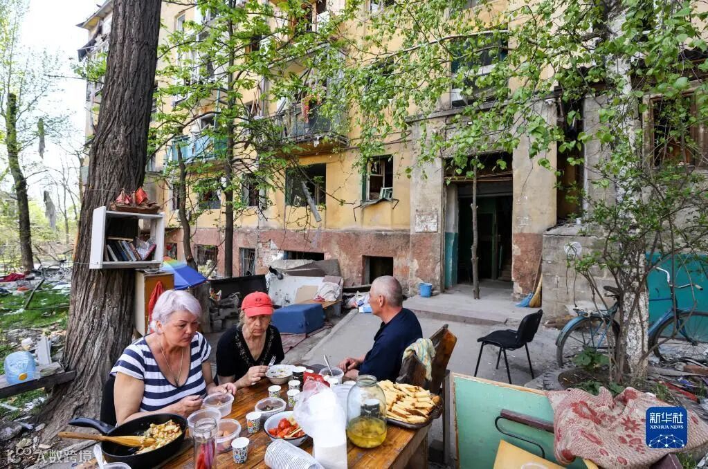 4月27日,在马里乌波尔,人们在户外用餐。新华社/塔斯社
