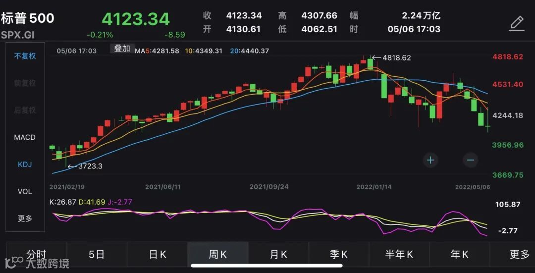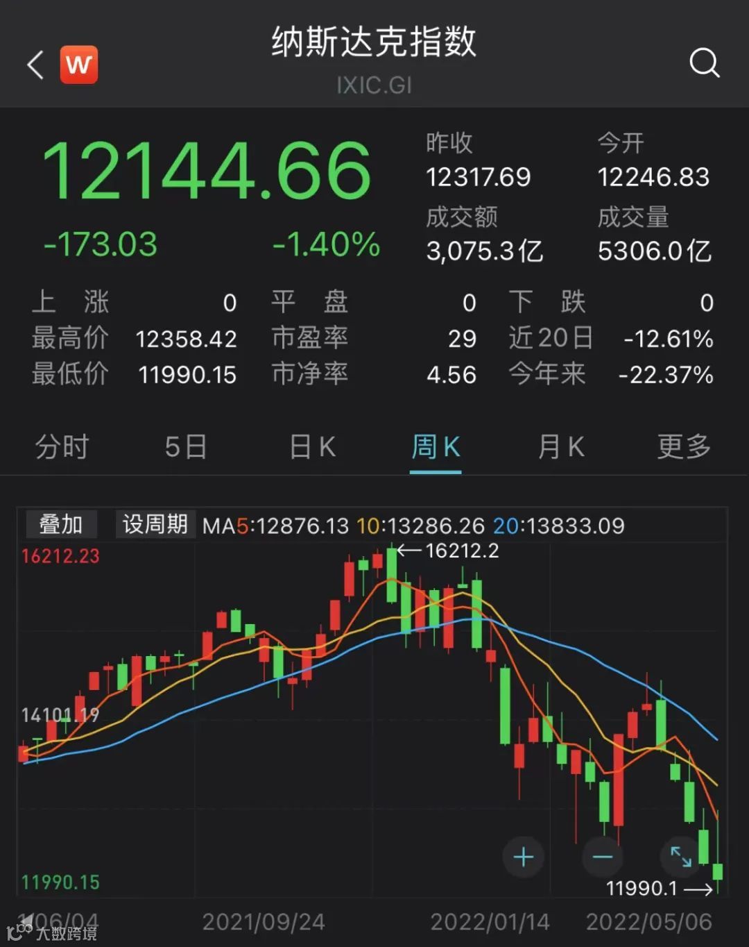 受美国货币政策转向鹰派等因素影响,美国股市自3月底以来表现持续低迷。数据显示,截至5月6日,与历史最高收盘点位相比,道指、标普500指数和纳指已分别累计下跌10.6%、14.04%和24.37%。