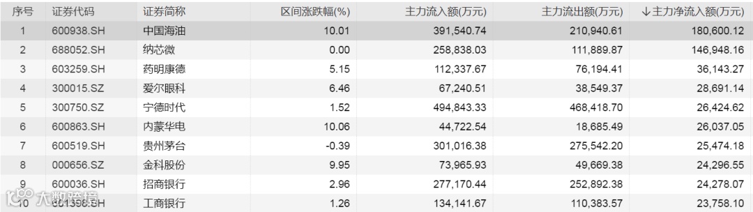 个股方面,中国海油、纳芯微、药明康德主力资金净流入金额居前,分别净流入18.06亿元、14.69亿元、3.61亿元。在今日主力资金净流入金额居前的股票中,有药明康德、贵州茅台这样的行业龙头股,也有工商银行这样的低估值股。