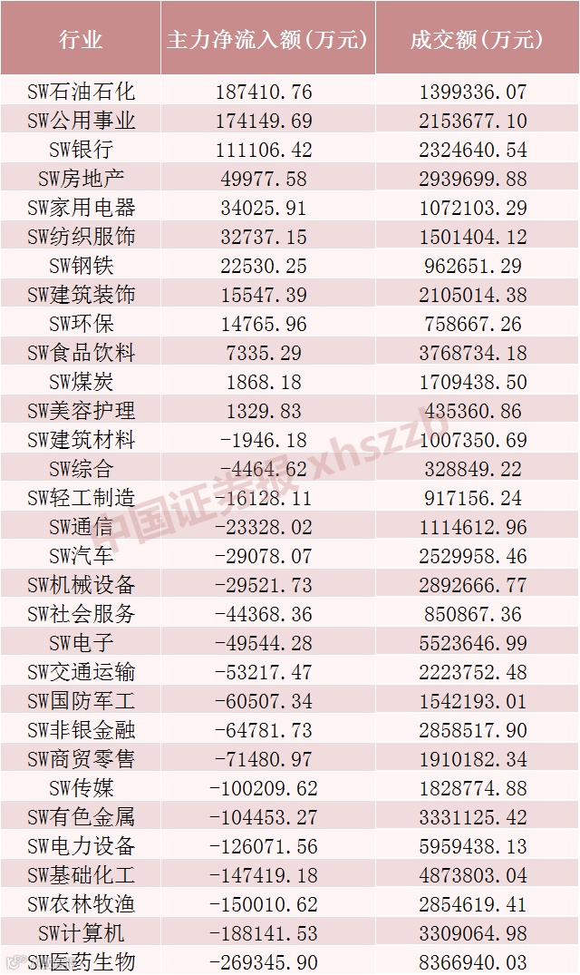 申万一级行业中,有12个行业获得资金净流入,石油石化、公用事业、银行行业主力资金净流入金额居前,分别净流入18.74亿元、17.41亿元、11.11亿元,低估值板块获得主力资金的显著加仓。医药生物、计算机、农林牧渔行业主力资金净流出金额居前,分别净流出26.93亿元、18.81亿元、15亿元。