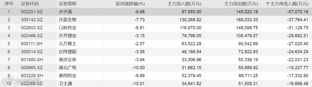 今日主力资金净流出金额前十股