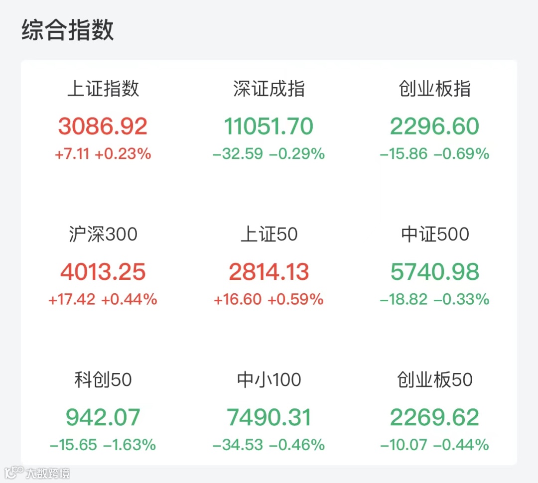 截至收盘,上证指数上涨0.23%,盘中最低跌破3050点,深证成指、创业板指分别下跌0.29%、0.69%,盘中均一度跌逾1%。两市成交超7500亿元,较昨日缩量,其中沪市成交额为3487.94亿元,深市成交额为4044.75亿元。