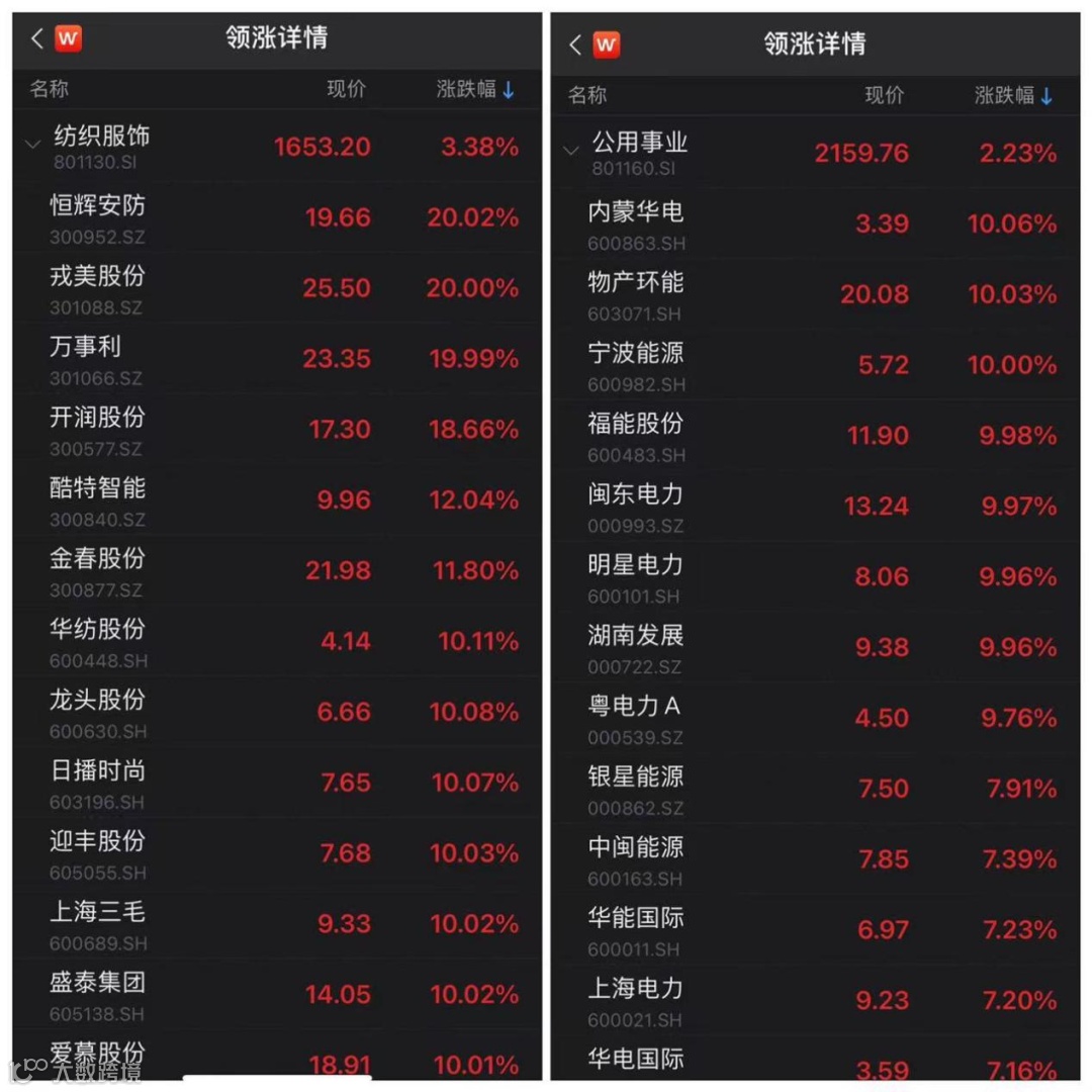 纺织服饰行业中,恒辉安防、戎美股份、万事利“20cm”涨停,开润股份涨逾18%,酷特智能涨逾12%,金春股份涨逾11%,华纺股份、龙头股份、日播时尚等多股涨停。