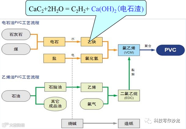 我国电石行业主要由煤基为主要原料,通过石灰石煅烧后产生的块状氧化钙与块状焦炭固固反应,在2200度高温下生产碳化钙,再由碳化钙与水反应生产乙炔(气体),由此产生泥浆就是电石渣。乙炔是PVC行业的重要原料,因此我国80%的PVC行业的乙炔都是来源于煤焦(煤炭)与块状氧化钙反应制备的电石。