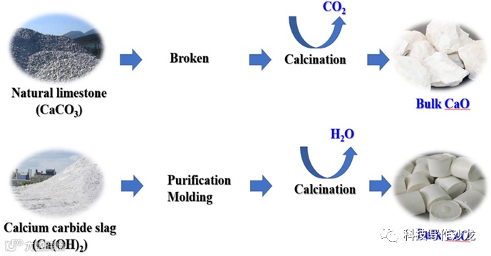 本技术采用水力旋流进行电石渣提纯,提纯后氢氧化钙纯度高达93%,成本每吨20元,通过常温粘结剂有压成型,制备高冷强度块料,成本每吨80元;在通过成核诱导剂诱导成球形颗粒,增加块料热强度;通过成型控温智能煅烧工艺,强化氧化钙球团的热强度,成本每吨250元。