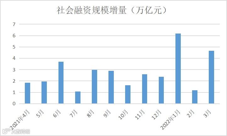 3月,社会融资规模增量为4.65万亿元,比上年同期多1.28万亿元