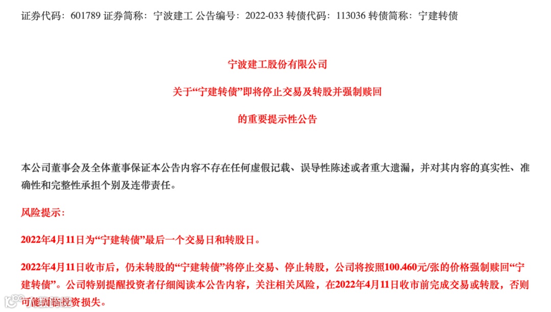 宁波建工称,此次可转债赎回价格可能与宁建转债的市场价格存在较大差异,特别提醒持有人注意在4月11日之前或当日完成交易或转股,否则可能面临较大投资损失。